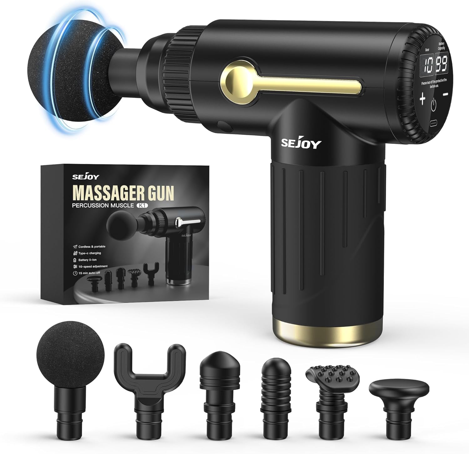 The Sejoy Deep Tissue Percussion Massage Gun features a compact design with an intuitive touch LED screen for easy control.
